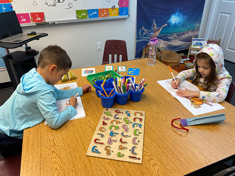This program introduces Pre-k students to the Arabic Alphabet. By the end of the program, students will be able to identify, sound, and write the Arabic letters in their independent and initial forms. They will be able to use basic greetings and leave taking, common expressions, introduce themselves, and understand basic classroom directions. They will also learn some songs and vocabulary for different topics; body parts, shapes, colors, fruits and vegetables, food, numbers, animals, nature, weather, seasons, and classroom objects.